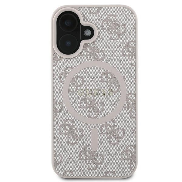 Tento kryt se pyšní charakteristickým designem 4G monogramu, který je celoplošně vyražen na povrchu v jemných růžových a béžových tónech, vytvářejících sofistikovaný texturovaný vzhled. Uprostřed zadní strany je elegantně umístěno kovové logo Guess, které je obklopeno kruhovým prvkem pro technologii MagSafe. Díky integrovaným magnetům je zajištěna bezproblémová kompatibilita s MagSafe příslušenstvím, což umožňuje rychlé a efektivní bezdrátové nabíjení a snadné připevnění doplňků. Kryt má precizní výřezy pro fotoaparát, porty a tlačítka, které jsou navrženy tak, aby dokonale kopírovaly linie telefonu a zároveň poskytovaly snadný přístup ke všem funkcím. Okraje krytu jsou mírně zvýšené, což poskytuje dodatečnou ochranu displeje a objektivů fotoaparátu před poškrábáním při položení na rovný povrch. Celkový design je elegantní, minimalistický a zároveň výrazně značkový, což z něj činí ideální módní doplněk.