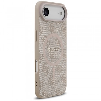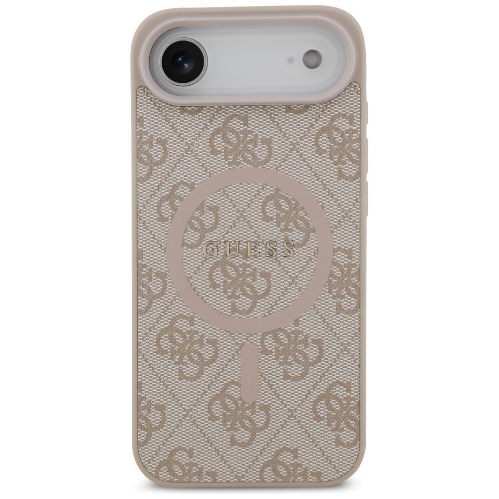 Pouzdro se pyšní charakteristickým celoplošným monogramem 4G v jemných růžových tónech, který je synonymem pro luxus a sofistikovanost značky Guess. Uprostřed zadní strany je elegantně integrován kruhový prvek s nápisem GUESS, který nejen zdůrazňuje prémiový původ, ale zároveň zajišťuje plnou kompatibilitu s technologií MagSafe. Díky tomu můžete snadno a bezpečně připevňovat MagSafe příslušenství a využívat bezdrátové nabíjení. Okraje pouzdra jsou v jednotné, mírně tmavší růžové barvě, což dodává celkovému vzhledu ucelenost a eleganci. Přesné výřezy pro fotoaparát, tlačítka a porty zaručují bezproblémové používání všech funkcí telefonu.