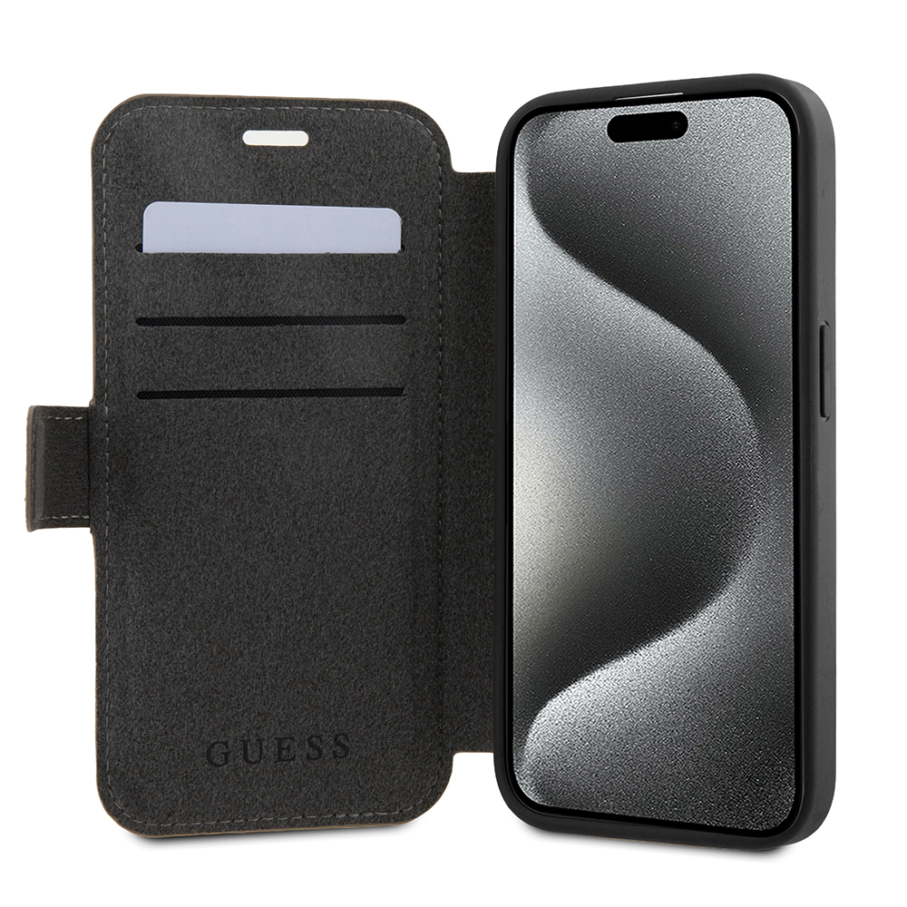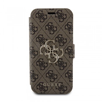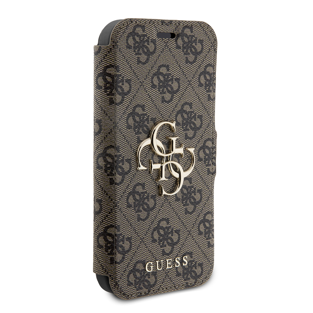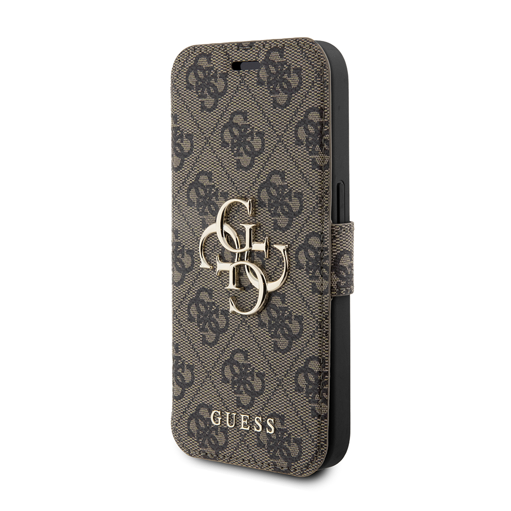Toto pouzdro typu "kniha" se pyšní sofistikovaným designem, který okamžitě upoutá pozornost. Vnější strana je pokryta charakteristickým celoplošným 4G monogramem v odstínech hnědé, který dodává pouzdru luxusní a rozpoznatelný vzhled. Dominantním prvkem je pak výrazné kovové logo Guess ve zlaté barvě, elegantně umístěné na přední straně, které podtrhuje exkluzivitu značky.