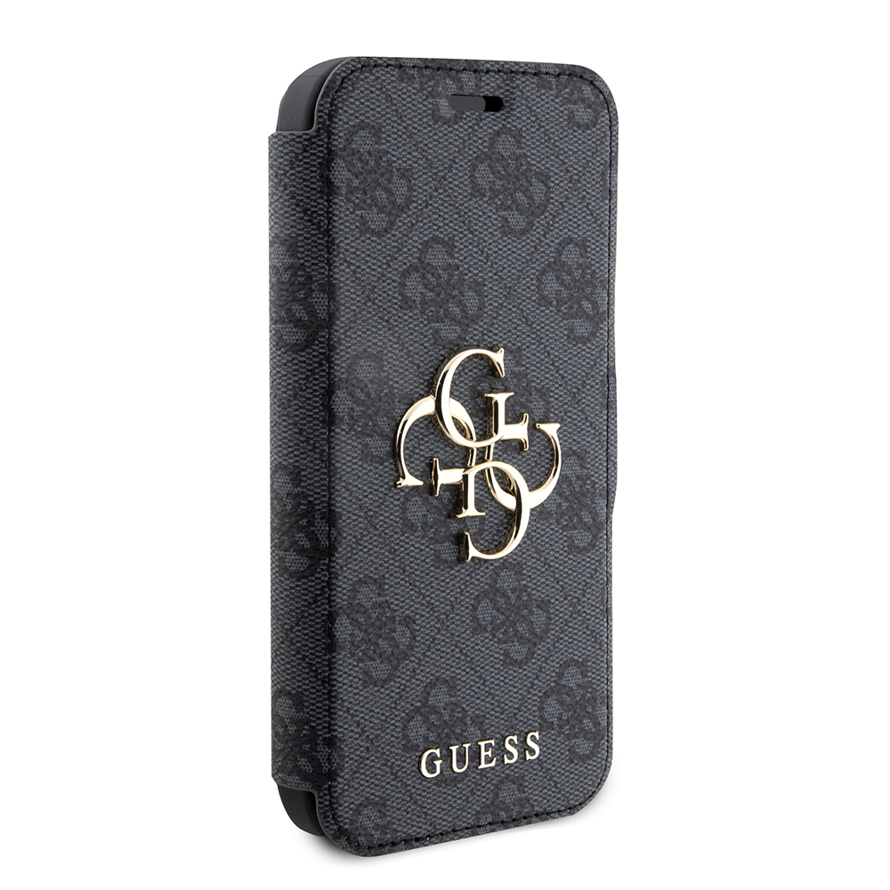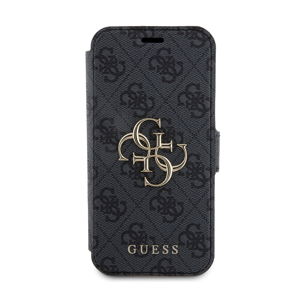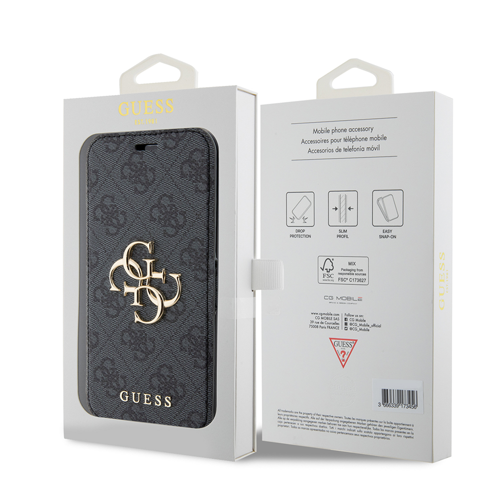 Pouzdro Guess Book 4G se pyšní sofistikovaným "book-style" designem, který chrání telefon ze všech stran. Vnější strana je potažena prémiovým materiálem s charakteristickým celoplošným monogramem 4G v decentních šedých tónech, což dodává pouzdru luxusní a okamžitě rozpoznatelný vzhled. Dominantou přední strany je výrazné zlaté logo Guess s propletenými písmeny "G", které je symbolem elegance a prestiže. Pouzdro je vybaveno praktickým magnetickým zavíráním, které zajišťuje bezpečné uzavření. Vnitřní strana nabízí tři sloty na kreditní karty nebo vizitky a jednu větší kapsu na bankovky či doklady, což z něj činí ideálního společníka pro každodenní nošení. Telefon je pevně uchycen v precizně tvarované vnitřní vaničce z pružného materiálu, která zaručuje snadnou instalaci a ochranu proti nárazům. Všechny výřezy pro fotoaparát, tlačítka a konektory jsou přesné a umožňují plné využití funkcí telefonu bez nutnosti vyjímání z pouzdra.