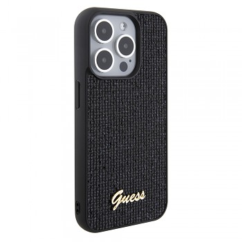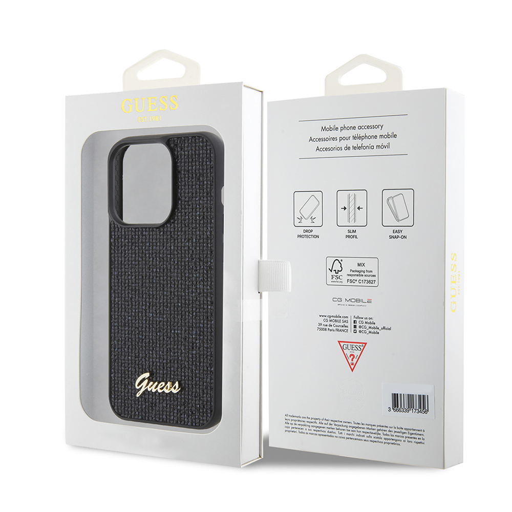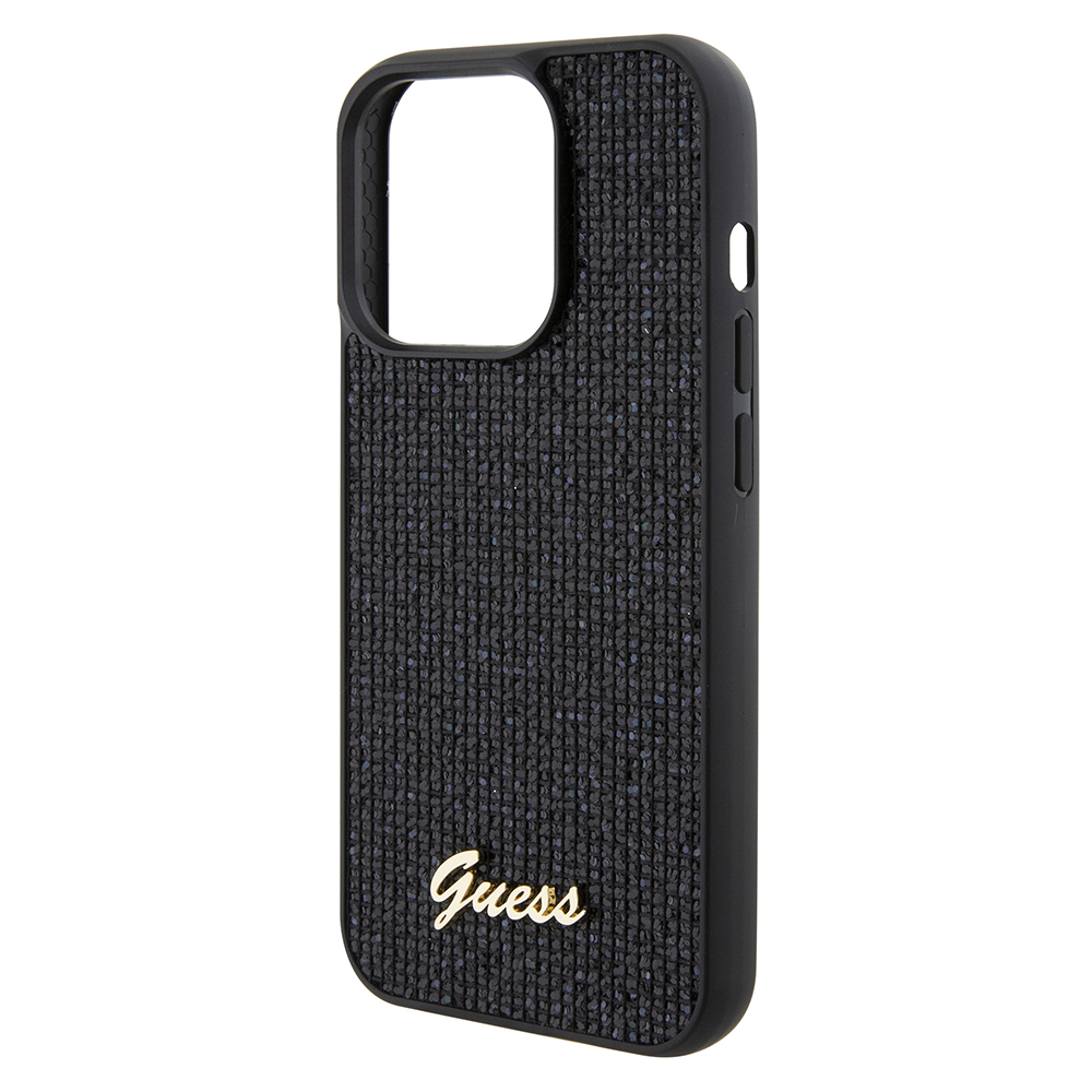 Kryt se pyšní sofistikovaným černým provedením s unikátní texturou připomínající jemnou tkaninu nebo diskotékové třpytky, které dodávají povrchu subtilní lesk a hloubku. Tento "disco" efekt zajišťuje, že váš telefon bude vždy zářit. Dominantou zadní strany je elegantní zlaté kovové logo Guess ve spodní části, které podtrhuje prémiový charakter a okamžitě upoutá pozornost. Kryt je navržen s přesnými výřezy pro fotoaparát a všechny porty, zatímco tlačítka jsou chráněna, ale zůstávají plně funkční. Díky svému štíhlému profilu dokonale padne do ruky a nepřidává telefonu zbytečný objem.