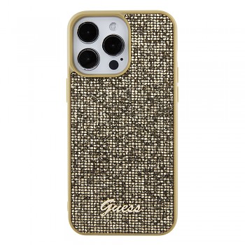 Kryt Guess Disco Metal Script je ztělesněním elegance a oslnivého lesku. Jeho design je inspirován dynamikou diskotékových světel, což se projevuje na zadní straně pouzdra. Ta je pokryta fascinující texturou drobných, třpytivých zlatých čtverečků, které vytvářejí jedinečný "disco" efekt a přitahují pohledy. Okraje pouzdra jsou vyrobeny z pružného materiálu v elegantním zlatavém odstínu, který zajišťuje snadnou instalaci a pohodlné držení. Dominantou zadní strany je pak precizně zpracované kovové logo Guess ve zlatém provedení, které dodává celému designu punc luxusu a originality.