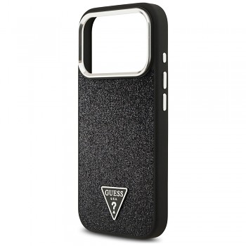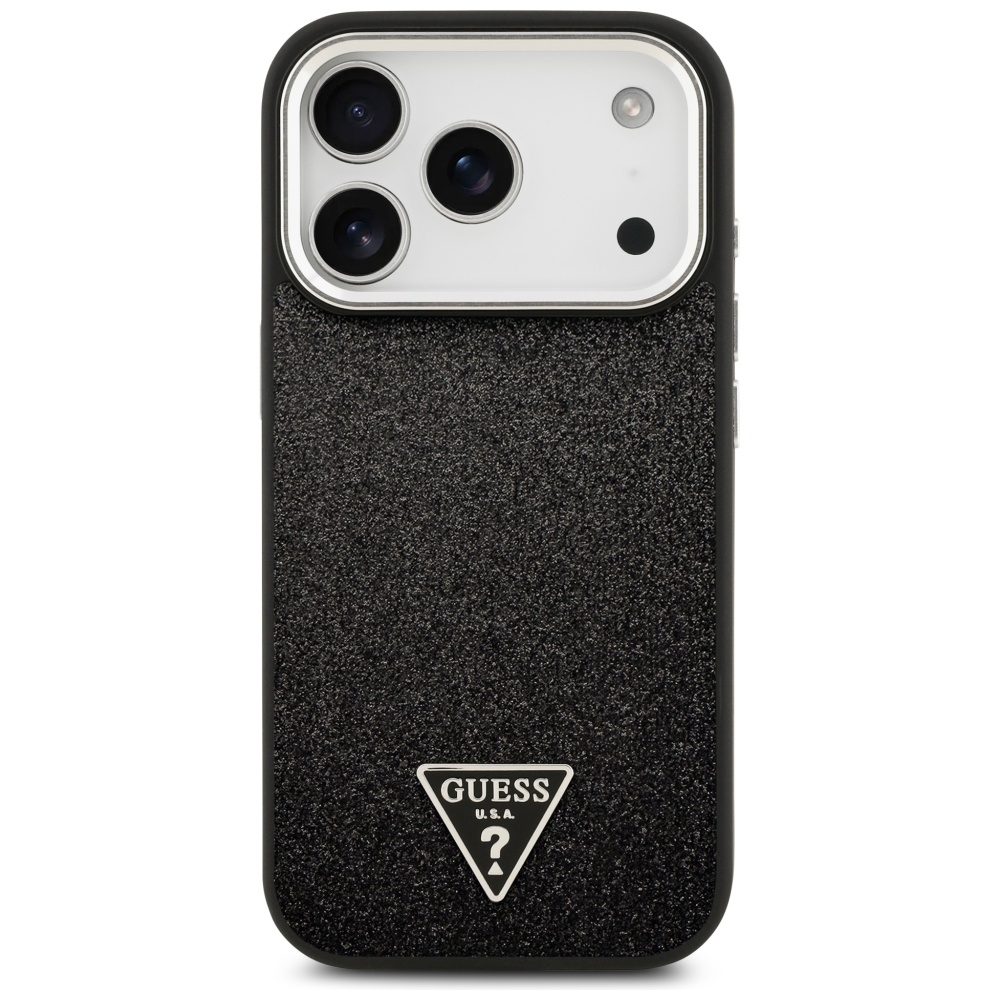 Pouzdro Guess Glitter Triangle Logo MagSafe pro iPhone 17 Pro se pyšní sofistikovaným designem, který okamžitě upoutá pozornost. Zadní strana krytu je pokryta elegantní černou třpytivou texturou, která dodává telefonu luxusní a jiskřivý vzhled. Ve spodní části zadní strany je decentně umístěno ikonické kovové logo Guess v trojúhelníku s nápisem "GUESS U.S.A." a otazníkem, které podtrhuje exkluzivitu značky.