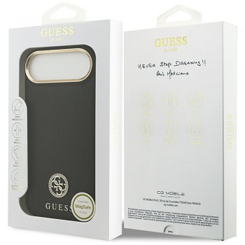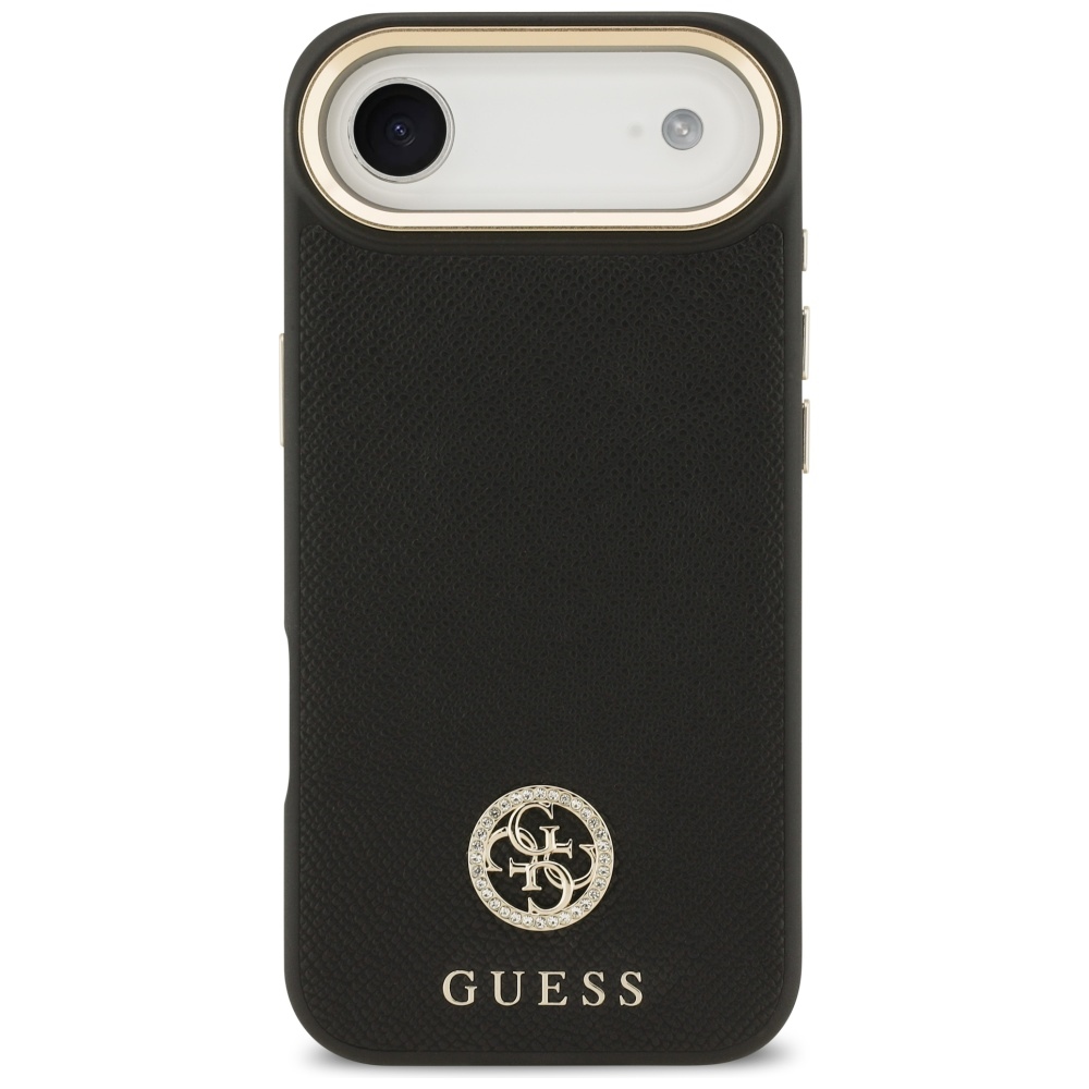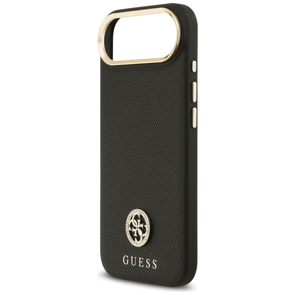 Pouzdro se pyšní sofistikovaným designem s zrnitou texturou, která připomíná luxusní kůži a zajišťuje příjemný pocit na dotek i pevný úchop. Dominantním prvkem je ikonické logo Guess, které je elegantně zasazeno do středu zadní strany pouzdra a zdobeno třpytivými kamínky (strass), dodávajícími pouzdru nádech exkluzivity a lesku. Zlaté detaily kolem modulu fotoaparátu a na bočních tlačítkách harmonicky doplňují celkový vzhled a podtrhují prémiový charakter produktu. Díky integrované technologii MagSafe je pouzdro plně kompatibilní s bezdrátovým nabíjením a MagSafe příslušenstvím, což zajišťuje maximální pohodlí a efektivitu. Pouzdro je vyrobeno z odolných materiálů, které chrání telefon před poškrábáním, drobnými nárazy a každodenním opotřebením, aniž by přidávalo zbytečný objem.
