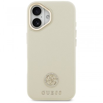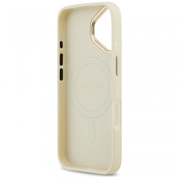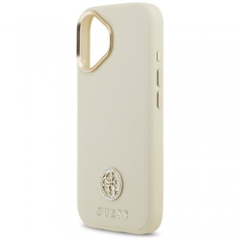 Kryt se pyšní luxusním zrnitým povrchem, který nejen skvěle vypadá, ale je i příjemný na dotek a zajišťuje pevný úchop. Dominantou zadní strany je ikonické logo Guess v kruhovém provedení, bohatě osázené třpytivými kamínky (strass), které dodávají pouzdru punc exkluzivity. Pod logem je decentně vyraženo jméno značky GUESS. Zlaté detaily, jako je lem kolem modulu fotoaparátu a samotné logo, dokonale doplňují béžový odstín a podtrhují prémiový vzhled. Díky precizním výřezům a integrovaným tlačítkům je zajištěn snadný přístup ke všem funkcím telefonu.