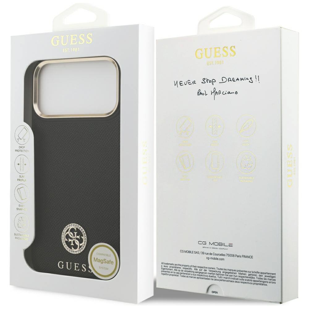 Pouzdro se pyšní precizním zpracováním a promyšlenými detaily. Zadní stranu zdobí výrazné kulaté logo Guess, které je bohatě osázeno třpytivými strass kamínky, dodávajícími pouzdru punc exkluzivity a lesku. Pod logem je pak zlatým písmem decentně vyveden nápis GUESS. Oblast kolem fotoaparátu je elegantně ohraničena zlatým rámečkem, který nejen chrání čočky, ale zároveň podtrhuje luxusní vzhled celého telefonu. Integrovaná technologie MagSafe zajišťuje bezproblémové a rychlé připojení k MagSafe příslušenství, což zaručuje maximální funkčnost a pohodlí. Kryt poskytuje spolehlivou ochranu proti poškrábání, drobným nárazům a nečistotám, zatímco zachovává tenký profil telefonu a snadný přístup ke všem tlačítkům a portům.