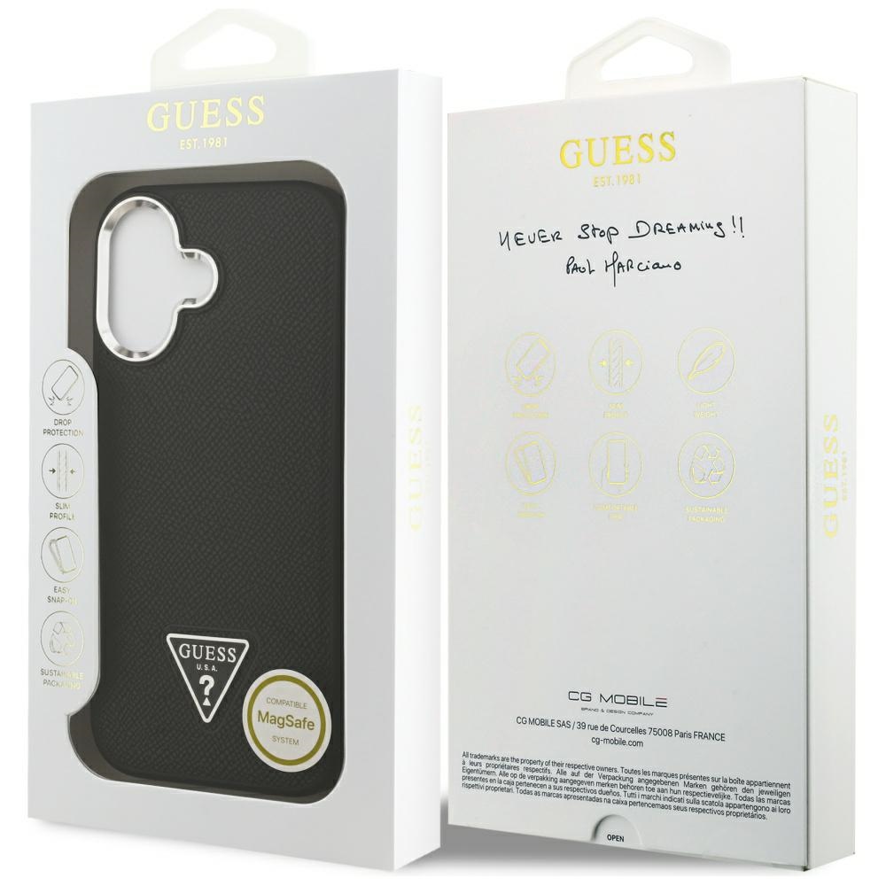 Pouzdro Guess Grained Triangle Logo MagSafe pro iPhone 17 se pyšní sofistikovaným designem, který okamžitě upoutá pozornost. Jeho povrch je tvořen jemně zrnitou texturou, připomínající luxusní Saffiano kůži, která nejen skvěle vypadá, ale je i příjemná na dotek a zlepšuje úchop telefonu. Dominantním prvkem je kovové stříbrné logo Guess v trojúhelníkovém tvaru, umístěné na zadní straně, které dodává pouzdru punc exkluzivity a originality. Okolí fotoaparátu je elegantně zvýrazněno stříbrným kovovým rámečkem, který chrání čočky a zároveň doplňuje celkový vzhled. Boční tlačítka jsou rovněž ve stříbrné barvě, což podtrhuje prémiový dojem a zajišťuje snadné ovládání.