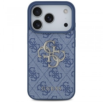 Pouzdro se pyšní ikonickým celoplošným monogramem 4G v odstínech modré, který dodává krytu sofistikovaný a rozpoznatelný vzhled. Uprostřed zadní strany je dominantně umístěno lesklé, stříbrné kovové logo Guess, které okamžitě upoutá pozornost a zdůrazňuje prestiž značky. Okraje pouzdra jsou v jednotné tmavě modré barvě, která elegantně rámuje telefon a zajišťuje pohodlné držení. Kryt je typu hardcase, což znamená, že je vyroben z pevného materiálu, který poskytuje spolehlivou ochranu proti poškrábání, drobným nárazům a každodennímu opotřebení. Přesné výřezy zaručují snadný přístup ke všem tlačítkům, portům a fotoaparátu, aniž by bylo nutné telefon z pouzdra vyjímat.