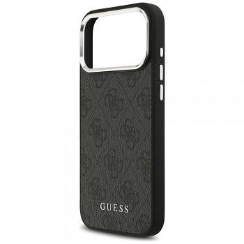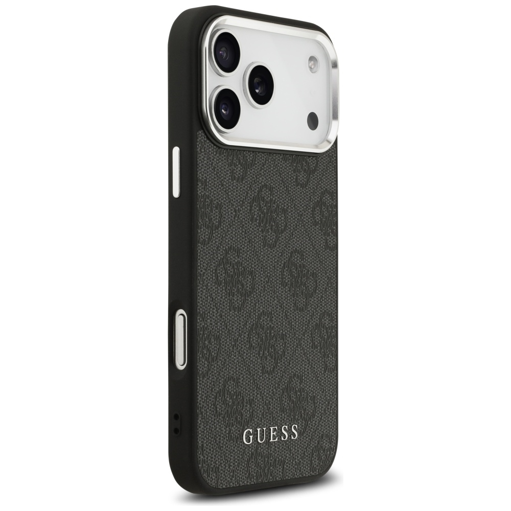 Pouzdro Guess Hardcase se pyšní sofistikovaným designem v černé barvě, který je charakteristický pro módní dům Guess. Zadní strana je zdobena celoplošným, decentním monogramem 4G, který dodává pouzdru luxusní a rozpoznatelný vzhled. Ve spodní části zadní strany je elegantně umístěno stříbrné logo GUESS, které podtrhuje prémiový charakter produktu. Oblast kolem fotoaparátu je zvýrazněna lesklým stříbrným rámečkem, který nejen chrání čočky, ale také dodává pouzdru moderní a stylový akcent. Pouzdro je typu hardcase, což znamená, že poskytuje pevnou ochranu proti nárazům a poškrábání, zatímco přesné výřezy zajišťují snadný přístup ke všem portům a tlačítkům. Integrovaná technologie MagSafe umožňuje rychlé a bezpečné připevnění MagSafe příslušenství a bezdrátové nabíjení.