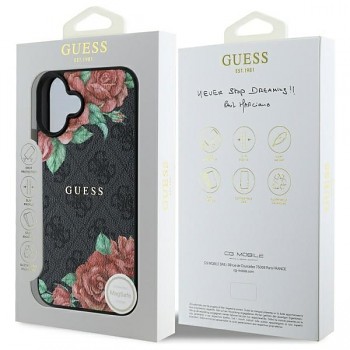 Pouzdro se pyšní sofistikovaným designem, který okamžitě upoutá pozornost. Základ tvoří černý podklad s decentním celoplošným monogramem 4G, který je pro značku Guess tak typický. Na tomto elegantním pozadí vynikají nádherné květinové motivy růží v odstínech růžové a červené s realistickými zelenými listy, strategicky umístěné v rozích pouzdra. Uprostřed zadní strany je pak hrdě umístěno výrazné bílé logo GUESS, které podtrhuje prémiový charakter produktu. Díky integrované technologii MagSafe je zajištěna bezproblémová kompatibilita s MagSafe příslušenstvím, což zvyšuje funkčnost a uživatelský komfort.