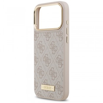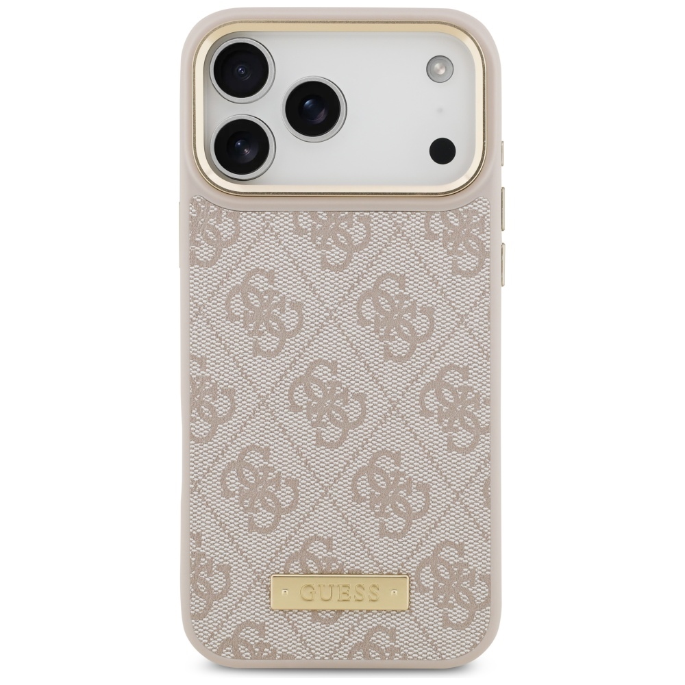 Pouzdro se pyšní sofistikovaným designem v něžném růžovém odstínu, který podtrhuje jeho luxusní charakter. Zadní strana je zdobena ikonickým celoplošným monogramem 4G, který je pro značku Guess tak typický a dodává pouzdru punc originality a prestiže. V dolní části zadní strany je elegantně umístěna kovová destička se zlatým logem Guess, jež slouží jako decentní, avšak výrazný designový prvek. Oblast kolem fotoaparátu je chráněna vyvýšeným zlatým rámečkem, který nejenže zabraňuje poškrábání čoček, ale zároveň esteticky doplňuje celkový vzhled pouzdra. Pouzdro je vyrobeno z odolného materiálu, který zajišťuje spolehlivou ochranu proti poškrábání, nečistotám a menším nárazům, přičemž si zachovává štíhlý profil. Samozřejmostí je plná kompatibilita s technologií MagSafe, což umožňuje snadné a rychlé bezdrátové nabíjení a připojení MagSafe příslušenství.
