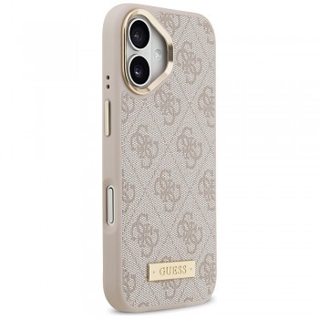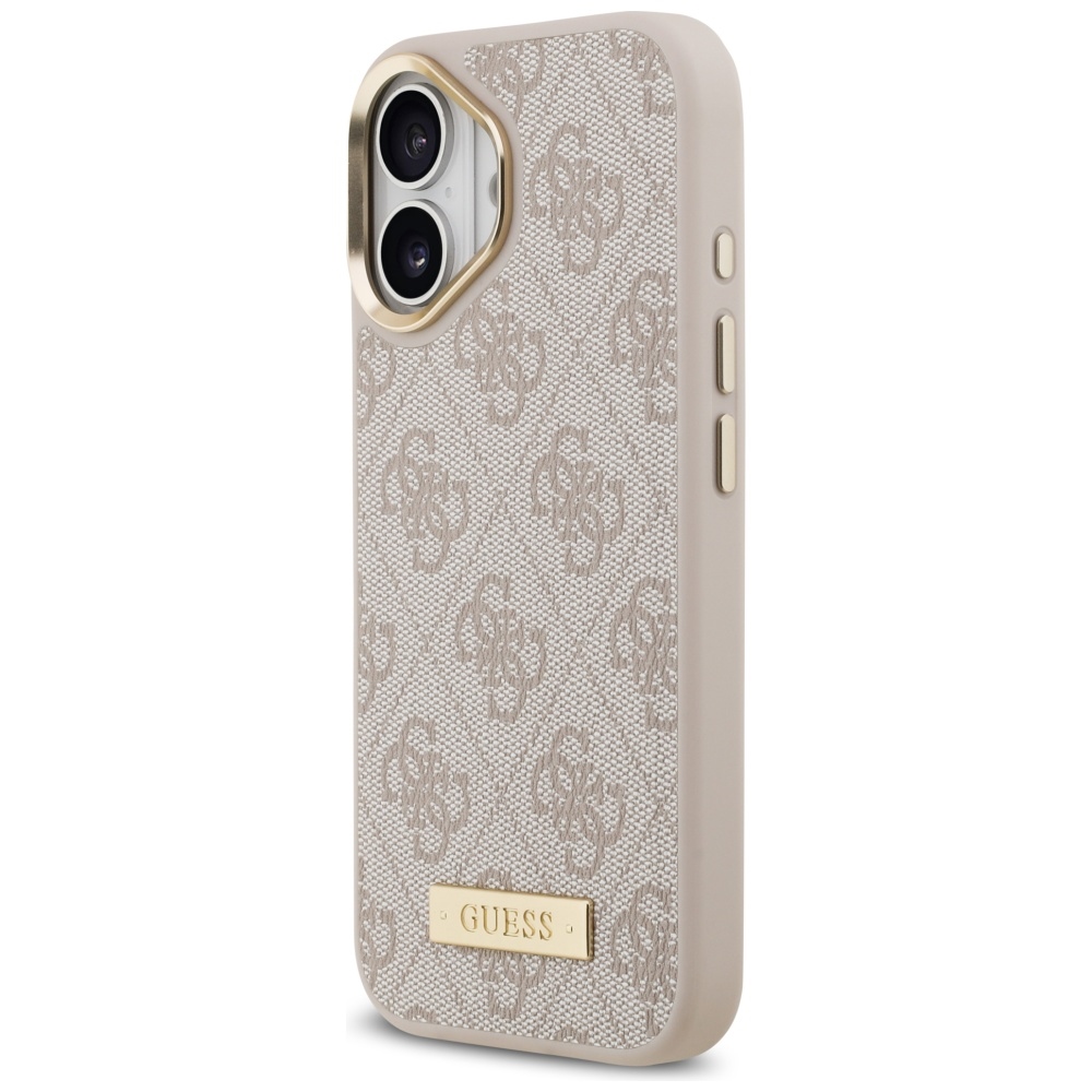 Pouzdro se pyšní sofistikovaným designem s celoplošným monogramem 4G, který je vyveden v jemných tónech růžové a béžové, dodávající mu punc originality a elegance. Na zadní straně je decentně umístěna zlatá kovová destička s nápisem GUESS, která podtrhuje prémiový charakter produktu. Oblast kolem fotoaparátu je zvýrazněna elegantním zlatým rámečkem, který nejen chrání čočky, ale zároveň slouží jako stylový detail.