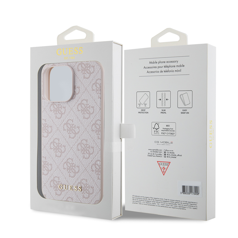 Tento konkrétní model v jemné růžové barvě okamžitě upoutá pozornost. Celoplošný monogram 4G, typický pro značku Guess, dodává pouzdru sofistikovaný a luxusní vzhled. Dominantním prvkem je pak elegantní kovové zlaté logo Guess, které je decentně umístěno a podtrhuje exkluzivitu produktu. Pouzdro typu "hardcase" zajišťuje pevnou ochranu zadní strany a hran telefonu, zatímco precizní výřezy zaručují snadný přístup ke všem portům a tlačítkům.