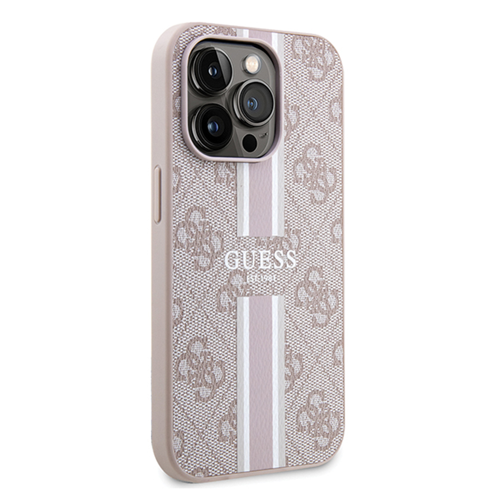 Pouzdro se pyšní sofistikovaným designem, který je pro značku Guess typický. Celý povrch je pokrytý jemným, ale výrazným monogramem 4G v béžových a růžových tónech, což dodává pouzdru luxusní a rozpoznatelný vzhled. Dominantním prvkem je vertikální pruh uprostřed zadní strany, který kombinuje světle růžové a bílé proužky, a je elegantně doplněn nápisem GUESS EST. 1981. Tento detail nejenže vizuálně prodlužuje linii telefonu, ale také jasně odkazuje na bohatou historii značky. Pouzdro je typu hardcase, což zaručuje pevnou a odolnou konstrukci, která chrání telefon před běžným opotřebením a drobnými nárazy. Integrovaná technologie MagSafe zajišťuje bezproblémovou kompatibilitu s bezdrátovým nabíjením a MagSafe příslušenstvím, což zvyšuje uživatelský komfort. Přesné výřezy pro fotoaparát, tlačítka a porty zaručují plnou funkčnost telefonu bez nutnosti pouzdro sundávat.