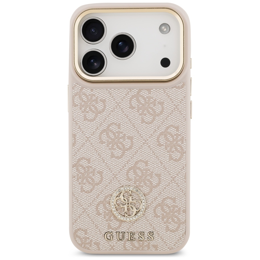 Pouzdro se pyšní sofistikovaným designem, který kombinuje klasické prvky značky Guess s moderní funkčností. Zadní strana je zdobena ikonickým 4G monogramem v jemném béžovém odstínu, který vytváří luxusní texturovaný vzhled. Dominantou je pak kruhové logo Guess s třpytivými kamínky (strass), které je umístěno ve spodní části a dodává pouzdru punc exkluzivity. Okraje pouzdra jsou v hladké růžové barvě, která ladí s celkovým provedením. Oblast kolem fotoaparátu je elegantně zvýrazněna zlatým rámečkem, který nejen chrání čočky, ale i přidává na estetické hodnotě. Díky integrované technologii MagSafe je zajištěna plná kompatibilita s bezdrátovým nabíjením a MagSafe příslušenstvím.