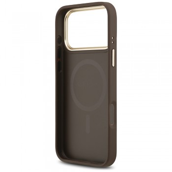 Toto pevné pouzdro se pyšní sofistikovaným designem, který kombinuje klasickou eleganci s moderními prvky. Základem je odolný hnědý materiál, který poskytuje spolehlivou ochranu proti poškrábání a drobným nárazům. Dominantou zadní strany je vertikální pruh s ikonickým 4G monogramem Guess v kontrastním světlejším odstínu, který je doplněn nápisem "GUESS". Precizní zpracování zahrnuje také zlaté/bronzové detaily kolem modulu fotoaparátu a na bočních tlačítkách, což dodává pouzdru luxusní vzhled. Díky integrované technologii MagSafe je zajištěna bezproblémová kompatibilita s bezdrátovým nabíjením a MagSafe příslušenstvím, což zvyšuje funkčnost a uživatelský komfort.