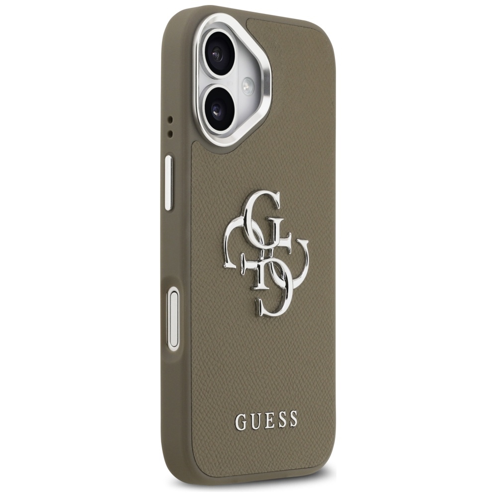 Pouzdro se pyšní sofistikovaným hnědým odstínem, který dodává vašemu telefonu luxusní a nadčasový vzhled. Jeho povrch je opatřen jemnou zrnitou texturou, připomínající elegantní Saffiano kůži, což zajišťuje příjemný pocit na dotek a zároveň zvyšuje odolnost proti drobným škrábancům. Dominantou zadní strany je výrazné, lesklé stříbrné logo Guess 4G, které je umístěno centrálně a okamžitě upoutá pozornost. Pod ním je decentně vyraženo stříbrné logo "GUESS". Pouzdro typu hardcase je precizně tvarováno tak, aby dokonale obepínalo křivky vašeho iPhone 17, s přesnými výřezy pro fotoaparát a porty. Tlačítka jsou chráněna, ale zůstávají plně funkční a citlivá na dotek.