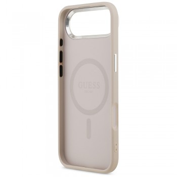 Pouzdro je vyrobeno jako pevný hardcase, který zajišťuje odolnost proti běžnému opotřebení a drobným nárazům. Jeho design je podtržen jemnou růžovou barvou, která dodává telefonu sofistikovaný a ženský vzhled. Dominantním prvkem je kovové logo Guess v trojúhelníkovém tvaru, umístěné ve spodní části zadní strany, které je synonymem luxusu a módního vkusu. Pouzdro je plně kompatibilní s technologií MagSafe, což umožňuje snadné a bezpečné přichycení MagSafe příslušenství a bezdrátové nabíjení. Na zadní straně je navíc decentně vyražen kruhový vzor s opakujícím se nápisem "GUESS", který vizuálně zvýrazňuje MagSafe oblast. Oblast kolem fotoaparátu je elegantně zvýrazněna vyvýšeným rámečkem v kontrastním odstínu, který chrání čočky před poškrábáním a dodává pouzdru prémiový vzhled. Boční tlačítka jsou rovněž v kontrastní barvě, což usnadňuje jejich ovládání a doplňuje celkový design.