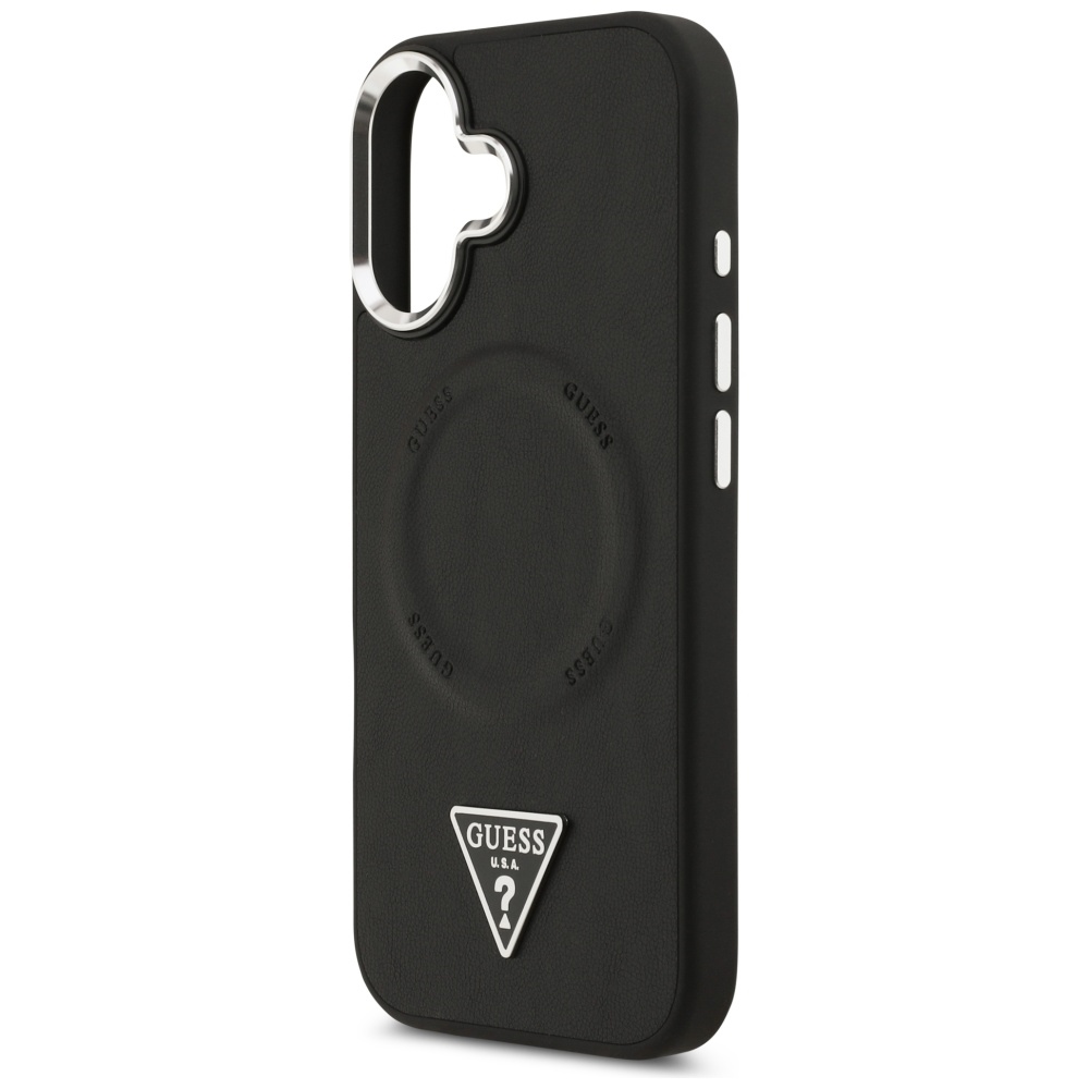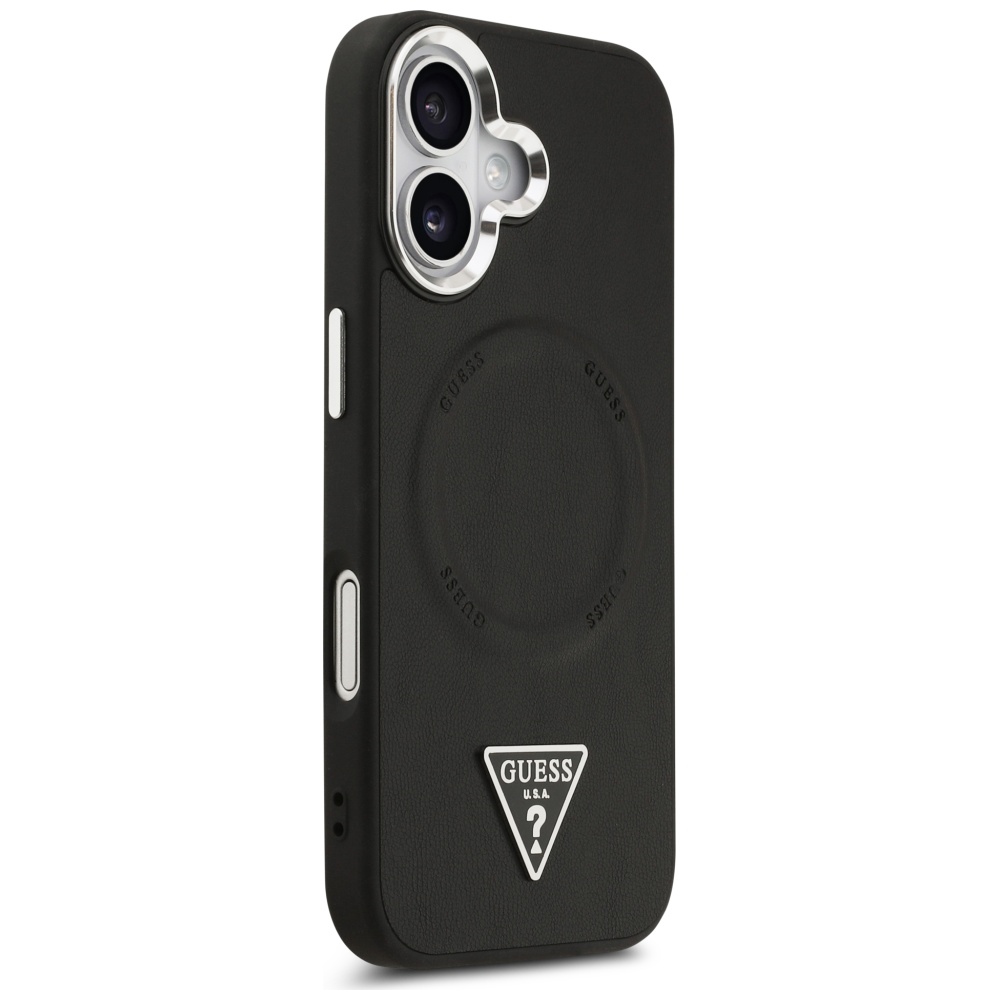Design pouzdra je ztělesněním sofistikovanosti. Zadní strana je vyrobena z kvalitního materiálu s jemnou, texturovanou povrchovou úpravou, která připomíná elegantní kůži a zajišťuje příjemný pocit v ruce. Dominantním prvkem je výrazné stříbrné kovové logo Guess v ikonickém trojúhelníkovém tvaru, umístěné ve spodní části. Okolo výřezu pro fotoaparát se táhne lesklý stříbrný rámeček, který dodává pouzdru luxusní vzhled a zároveň chrání čočky. Tlačítka hlasitosti a napájení jsou rovněž vyvedena ve stříbrné barvě, což vytváří harmonický kontrast s černým tělem pouzdra. V centrální části zadní strany je decentně vyraženo kruhové logo Guess, které podtrhuje kompatibilitu s MagSafe.
