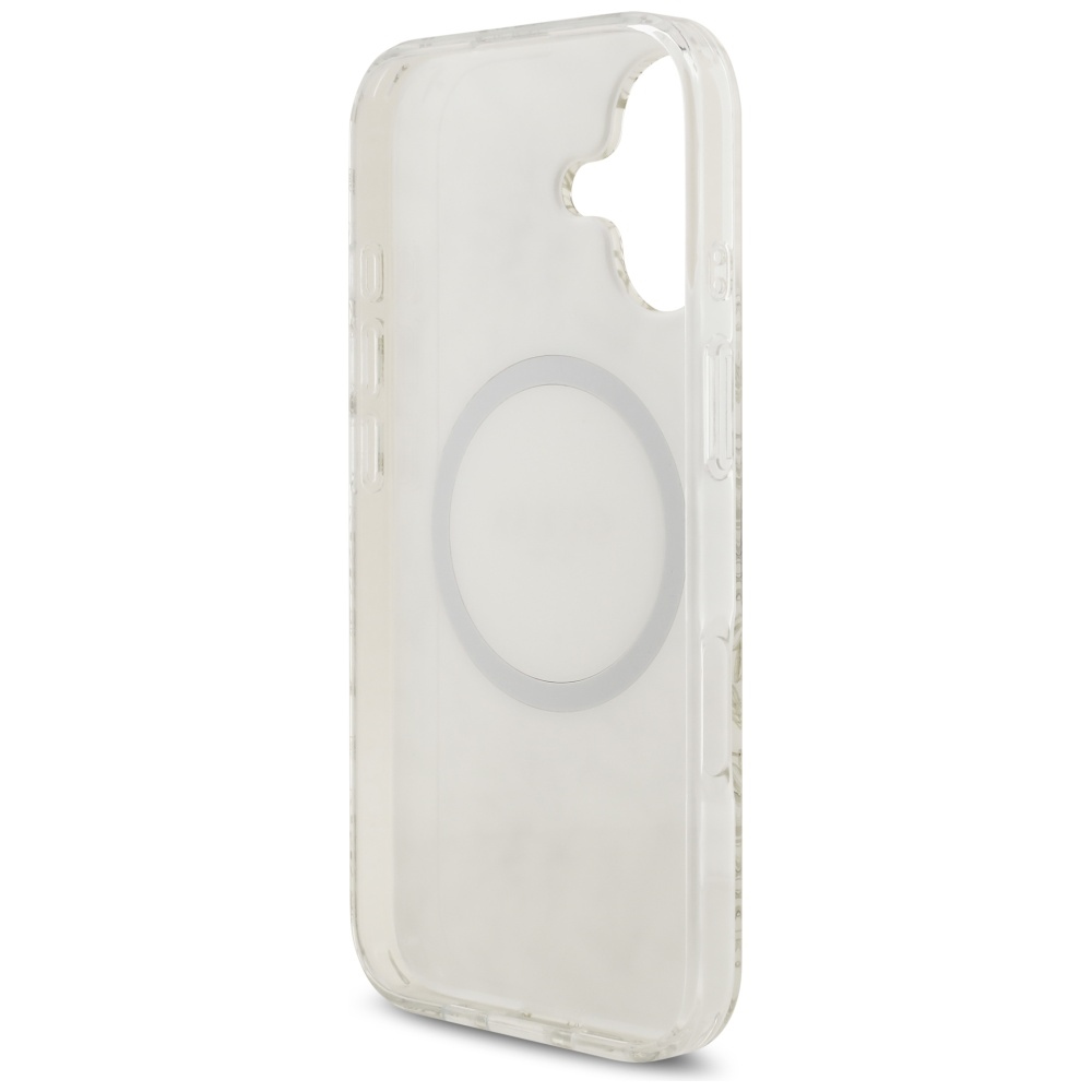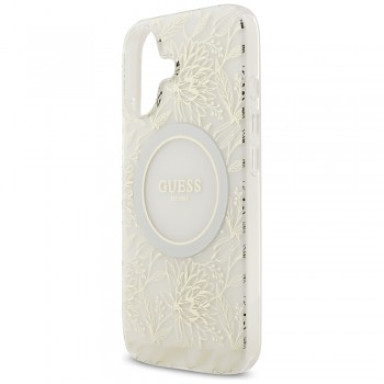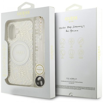Tento kryt se pyšní průhledným designem s jemným, ale výrazným květinovým vzorem, který je vkusně vyveden v bílých a krémových tónech. Na zadní straně dominuje elegantní kruhový prvek s logem GUESS EST. 1981, který zároveň indikuje plnou kompatibilitu s technologií MagSafe. Díky tomu můžete snadno a rychle připojovat MagSafe příslušenství a využívat bezdrátové nabíjení. Součástí balení je také luxusní perlový řemínek, který dodává krytu jedinečný šarm. Řemínek je tvořen kombinací čirých, fasetovaných perel a drobných zlatých korálků, s nápisem GUESS ve zlatých písmenech, což umožňuje pohodlné a bezpečné nošení telefonu na zápěstí. Kryt je vyroben z odolného, ale flexibilního materiálu, který poskytuje spolehlivou ochranu proti poškrábání, nárazům a běžnému opotřebení, aniž by zbytečně zvětšoval objem telefonu.