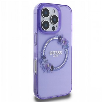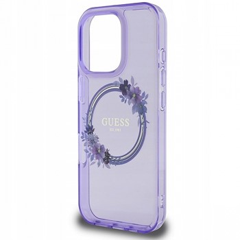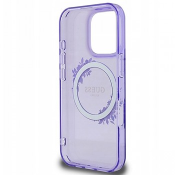 Pouzdro Guess IML Flowers Wreath MagSafe se pyšní průsvitným fialovým provedením, které nechá vyniknout originální design vašeho iPhone 16 Pro. Dominantou zadní strany je stříbrný kruh MagSafe, který je elegantně obklopen nádherným věncem z jemných fialových a modrých květin. Uprostřed kruhu je decentně umístěno ikonické logo GUESS EST. 1981, které dodává pouzdru punc luxusu a originality. Přesné výřezy pro fotoaparát a porty zajišťují plnou funkčnost, zatímco zvýšené okraje kolem objektivu fotoaparátu a displeje poskytují dodatečnou ochranu proti poškrábání a nárazům. Boční tlačítka jsou kryta průhledným materiálem, což zachovává jejich citlivost a snadné ovládání.