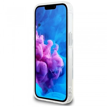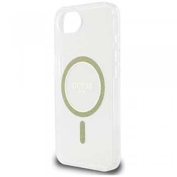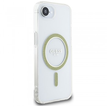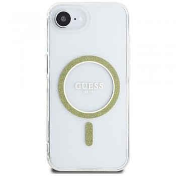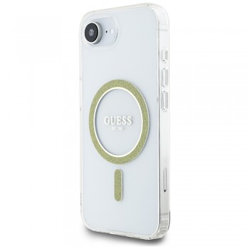 Pouzdro se pyšní průhledným provedením, které nechává vyniknout barvu a eleganci vašeho iPhonu. Dominantním prvkem na zadní straně je výrazný kruhový třpytivý prvek ve světle zlaté barvě, který zároveň slouží jako integrovaný MagSafe kroužek. Uvnitř tohoto třpytivého kruhu je decentně umístěno logo „GUESS EST. 1981“, které podtrhuje autentičnost a prestiž značky. Pod hlavním kruhem se nachází menší vertikální třpytivý proužek, který doplňuje MagSafe design a zajišťuje perfektní kompatibilitu s MagSafe příslušenstvím. Kryt je vyroben s přesnými výřezy pro fotoaparát, tlačítka a porty, což zaručuje snadný přístup ke všem funkcím telefonu. Díky svému štíhlému profilu pouzdro nepřidává telefonu zbytečný objem a zajišťuje pohodlný úchop.