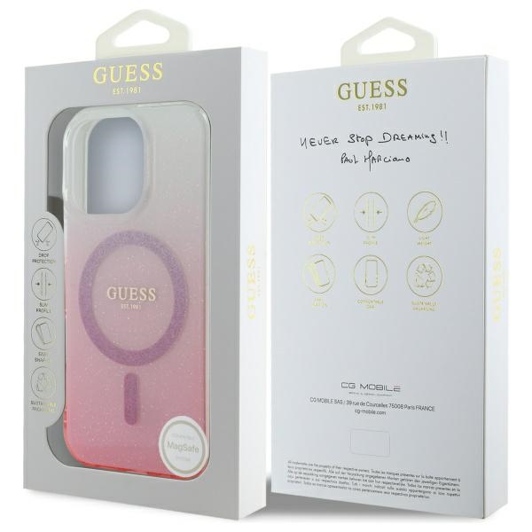 Představujeme vám exkluzivní kryt Guess IML Glitter Gradient MagSafe, který dokonale podtrhne eleganci vašeho telefonu. Tento kryt se pyšní oslnivým třpytivým gradientem, který plynule přechází z průzračné horní části do sytě růžového odstínu ve spodní části. Celý povrch je poset jemnými třpytkami, které dodávají pouzdru luxusní a hravý vzhled. Uprostřed zadní strany je elegantně umístěno logo Guess EST. 1981, které je obklopeno výrazným kruhem a svislou čárkou, indikujícími plnou kompatibilitu s technologií MagSafe. Díky tomu si můžete užívat rychlé a bezpečné bezdrátové nabíjení a snadné připojení MagSafe příslušenství. Kryt je navržen tak, aby přesně kopíroval křivky vašeho telefonu, poskytoval snadný přístup ke všem tlačítkům a portům a zároveň chránil zařízení před běžným opotřebením a drobnými nárazy. Jeho tenký profil zachovává původní design telefonu a nepřidává zbytečný objem.
