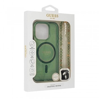 Nejvýraznějším prvkem je bezesporu perlový řemínek, který je k pouzdru připevněn a slouží nejen jako stylový doplněk, ale i jako praktická pomůcka pro bezpečné držení telefonu. Řemínek je tvořen kombinací zelených korálků s efektem prasklin a menších zlatých korálků, které doplňují bílé korálky s nápisem GUESS. Tento detail podtrhuje jedinečnost a módní charakter celého produktu. Kryt je navržen s ohledem na štíhlý profil a snadné nasazení, přičemž poskytuje ochranu proti pádům a je dodáván v udržitelném balení.