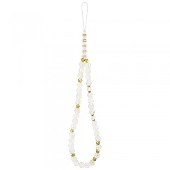 Součástí balení je stylový perlový řemínek, který slouží jako praktické poutko na zápěstí a zároveň jako šperk pro váš telefon. Řemínek je tvořen kombinací průhledných perlových korálků, zlatých metalických detailů a bílých korálků s nápisem "GUESS" ve zlaté barvě. Tento detail nejen zvyšuje bezpečnost úchopu, ale také podtrhuje celkový luxusní dojem. Pouzdro je vyrobeno z odolného materiálu, který chrání váš telefon před poškrábáním a drobnými nárazy, zatímco přesné výřezy zajišťují snadný přístup ke všem tlačítkům a portům.
