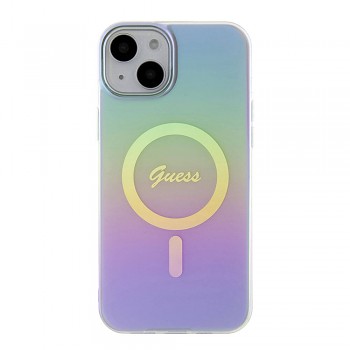 Pouzdro Guess IML Iridescent MagSafe se pyšní jedinečným iridescentním povrchem, který hraje všemi barvami duhy. V závislosti na úhlu pohledu a dopadajícím světle se barva pouzdra mění z jemné fialové přes modré a zelené tóny až po náznaky žluté a oranžové, čímž vytváří fascinující vizuální efekt. Střed zadní strany zdobí výrazný MagSafe kroužek, který je elegantně integrován do designu a nese decentní nápis Guess. Průhledné boky pouzdra pak nechávají vyniknout originální design vašeho telefonu, zatímco precizní výřezy zajišťují snadný přístup ke všem portům a tlačítkům.