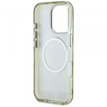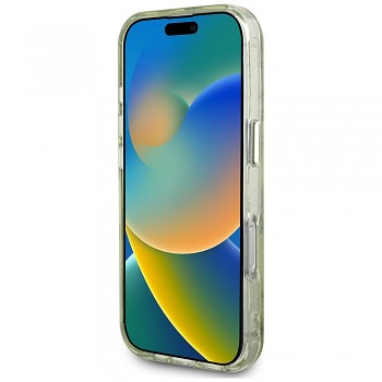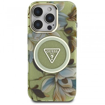 Pouzdro se pyšní sofistikovaným designem s květinovým motivem v jemných odstínech, který je zasazen do třpytivého zeleného pozadí. Celý povrch je obohacen o decentní třpytky, které dodávají krytu luxusní vzhled a hravý nádech. Dominantním prvkem je ikonické logo Guess v trojúhelníkovém provedení, elegantně umístěné v kruhovém rámečku, který zároveň slouží jako MagSafe prvek pro snadné a bezpečné uchycení příslušenství. Okraje pouzdra jsou průhledné a rovněž obsahují jemné třpytky, což zajišťuje, že původní design telefonu zůstane viditelný a zároveň je dokonale chráněn. Precizní výřezy pro fotoaparát a porty zaručují plnou funkčnost bez kompromisů.