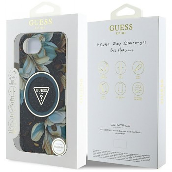 Tento konkrétní model krytu Guess pro iPhone 16e se pyšní sofistikovaným designem. Zadní strana je vyvedena v elegantní černé barvě, kterou zdobí jemný, ale výrazný květinový vzor v odstínech světle modré a béžové, dodávající pouzdru romantický a zároveň moderní vzhled. Celý povrch je navíc poset jemnými třpytkami, které se diskrétně lesknou a dodávají pouzdru punc luxusu. Dominantním prvkem je pak kovové logo Guess s ikonickým trojúhelníkem a otazníkem, umístěné v kruhovém rámečku uprostřed zadní strany, které zároveň slouží jako MagSafe kompatibilní prvek. Díky technologii MagSafe je zajištěno snadné a bezpečné přichycení MagSafe příslušenství a bezdrátové nabíjení. Boky pouzdra jsou průhledné s integrovanými třpytkami, což umožňuje vyniknout původní barvě vašeho telefonu a zároveň poskytuje komplexní ochranu.