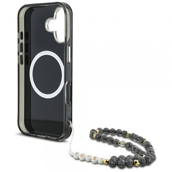 Jedinečným prvkem tohoto pouzdra je odnímatelný perlový řemínek, který dodává celému designu punc luxusu a originality. Řemínek je tvořen kombinací tmavých, texturovaných korálků, elegantních zlatých detailů a bílých korálků, které dohromady skládají nápis "GUESS". Tento řemínek nejenže slouží jako stylový doplněk, ale zároveň zvyšuje bezpečnost držení telefonu a minimalizuje riziko pádu. Boční strany pouzdra jsou vyrobeny z průhledného, lehce kouřového materiálu, který umožňuje vyniknout originálnímu designu telefonu a zároveň poskytuje ochranu proti nárazům a poškrábání.