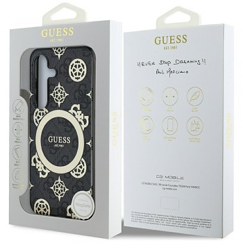 Tento konkrétní model krytu se pyšní sofistikovaným designem, který kombinuje klasické prvky značky Guess s moderními technologiemi. Povrch krytu je zdoben opakujícím se vzorem 4G monogramu v kombinaci se stylizovanými květinovými motivy, které připomínají pivoňky (Peony), vše v decentních odstínech černé a béžové. V centrální části krytu je elegantně integrován MagSafe kroužek ve světle béžové barvě, který nejenže dodává krytu punc luxusu, ale zároveň zajišťuje plnou kompatibilitu s MagSafe příslušenstvím pro snadné a rychlé bezdrátové nabíjení či připojení dalších doplňků. Uprostřed MagSafe kroužku je pak hrdě umístěno logo GUESS EST. 1981. Kryt je vyroben z odolného materiálu, který poskytuje ochranu proti poškrábání, drobným nárazům a nečistotám, zatímco přesné výřezy zajišťují snadný přístup ke všem portům a tlačítkům telefonu. Zvýšené okraje kolem displeje a fotoaparátu navíc chrání tyto nejcitlivější části telefonu před přímým kontaktem s povrchem.