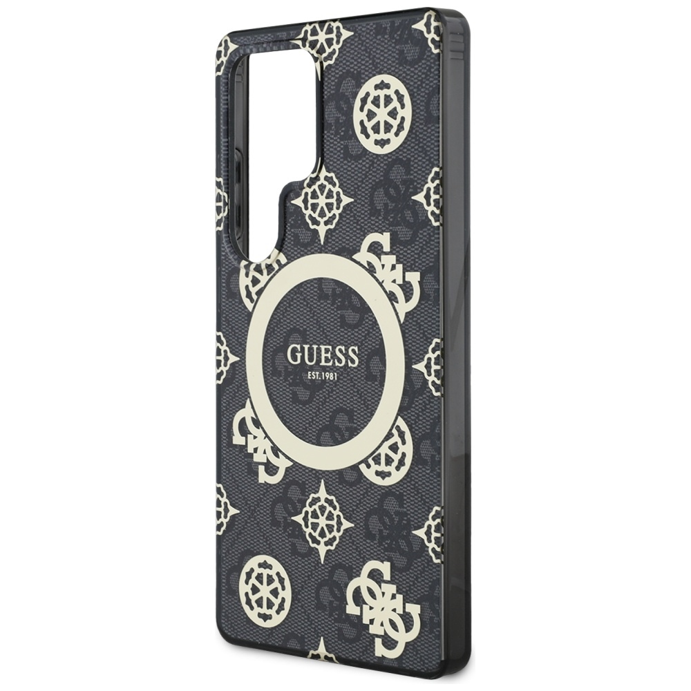Pouzdro se pyšní sofistikovaným designem v černé barvě, který je zdoben opakujícím se vzorem ikonického 4G monogramu značky Guess a stylizovanými květinovými motivy, připomínajícími pivoňky, v elegantním krémově béžovém odstínu. Tento vzor je aplikován technologií IML (In-Mold Labeling), která zajišťuje jeho vysokou odolnost proti poškrábání a dlouhotrvající sytost barev. Dominantou zadní strany je výrazný kruhový prvek s logem GUESS EST. 1981, který zároveň slouží jako integrovaný MagSafe kroužek pro snadné a bezpečné připojení kompatibilního příslušenství. Pouzdro je vyrobeno z odolného materiálu, který poskytuje spolehlivou ochranu proti nárazům, pádům a každodennímu opotřebení, aniž by přidávalo telefonu zbytečný objem. Přesné výřezy zajišťují plný přístup ke všem portům, tlačítkům a fotoaparátu.