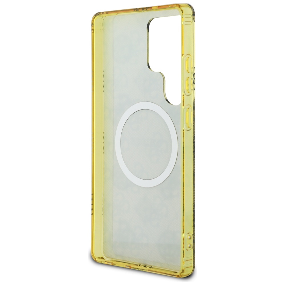 Kryt se pyšní elegantním hnědým provedením, které je zdobeno charakteristickým 4G monogramem značky Guess. Tento celoplošný vzor dodává pouzdru luxusní a sofistikovaný vzhled. Dominantou zadní strany je výrazné kruhové logo Guess s nápisem "EST. 1981", které je umístěno v centru a podtrhuje prestiž a dědictví značky. Okraje krytu jsou provedeny v průsvitné žlutohnědé barvě, která harmonicky doplňuje celkový design a zároveň umožňuje vyniknout originálním křivkám vašeho telefonu. Integrovaná technologie MagSafe zajišťuje snadné a bezpečné přichycení kompatibilního příslušenství a bezdrátové nabíjení.