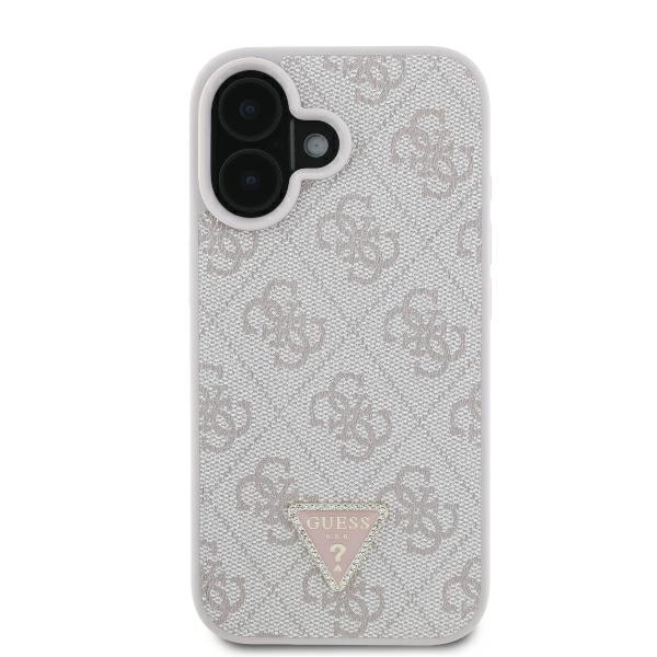 Pouzdro je vyrobeno z kvalitní kůže v něžném růžovém odstínu, který je doplněn decentním, celoplošným monogramem 4G, typickým pro značku Guess. Dominantou designu je kovové trojúhelníkové logo Guess, které je precizně osázeno třpytivými kamínky (strass), dodávajícími pouzdru luxusní a sofistikovaný vzhled. Přesné výřezy pro fotoaparát, tlačítka a konektory zajišťují bezproblémové používání všech funkcí telefonu.