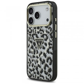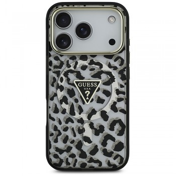 Pouzdro Guess Leopard Glitter MagSafe pro iPhone 17 Pro Max v černém provedení je ztělesněním elegance a moderního designu. Jeho transparentní základ zdobí výrazný leopardí vzor v černé barvě, který je doplněn o jemné stříbrné třpytky, dodávající pouzdru oslnivý lesk a dynamiku. Uprostřed zadní strany je elegantně umístěno kovové logo Guess v trojúhelníku s otazníkem, které je obklopeno integrovaným MagSafe kroužkem. Ten zajišťuje perfektní kompatibilitu s MagSafe příslušenstvím a bezdrátovým nabíjením.