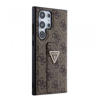 Guess PU Grip Stand 4G Strass Triangle Metal Logo Zadní Kryt pro Samsung Galaxy S24 Ultra Brown