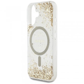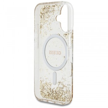 Pouzdro se pyšní průhledným provedením, které nechá vyniknout originální barvu vašeho telefonu, zatímco mu dodá nádech luxusu. Zadní strana je bohatě poseta zlatými třpytkami, které vytvářejí fascinující efekt a upoutají pozornost. Třpytky jsou elegantně rozprostřeny po celé ploše, s mírnou koncentrací v dolní části, což dodává pouzdru dynamický vzhled. Dominantním prvkem je integrovaný MagSafe kroužek ve zlaté barvě, který zajišťuje perfektní kompatibilitu s MagSafe příslušenstvím a zároveň elegantně nese nápis GUESS, podtrhující prestiž značky. Precizní výřezy pro fotoaparát a porty zaručují plnou funkčnost a snadný přístup ke všem ovládacím prvkům.