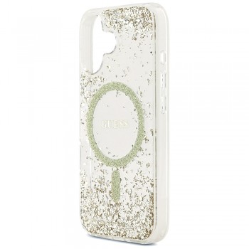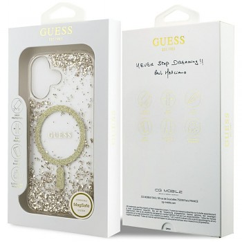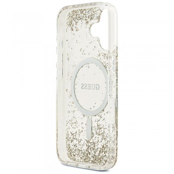 Pouzdro se pyšní průhledným designem, který nechá vyniknout originální krásu vašeho telefonu, zatímco je obohaceno o fascinující zlaté třpytky, které se volně pohybují a vytvářejí dynamický efekt. Dominantním prvkem je integrovaný MagSafe kroužek v zářivé zlaté barvě, který zajišťuje perfektní kompatibilitu s MagSafe příslušenstvím a zároveň slouží jako výrazný designový prvek s elegantním logem Guess uprostřed. Pouzdro je navrženo s ohledem na štíhlý profil a snadné nasazení, přičemž poskytuje spolehlivou ochranu proti pádům a běžnému opotřebení.