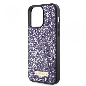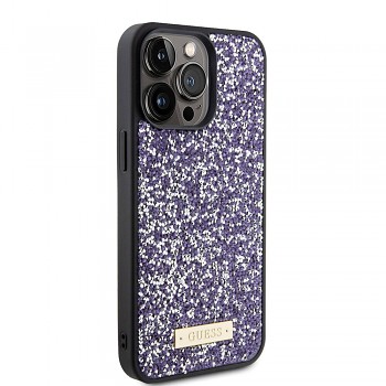 Pouzdro Guess Rhinestone Metal Logo se pyšní oslnivým designem, který okamžitě upoutá pozornost. Zadní strana je pokryta třpytivou texturou v odstínech fialové a bílé, evokující vzhled drobných kamínků nebo třpytek, které se nádherně lesknou na světle. Ve spodní části zadní strany je elegantně umístěna malá, zlatě zbarvená kovová destička s precizně vyrytým nápisem "GUESS", což dodává pouzdru punc luxusu a originality.