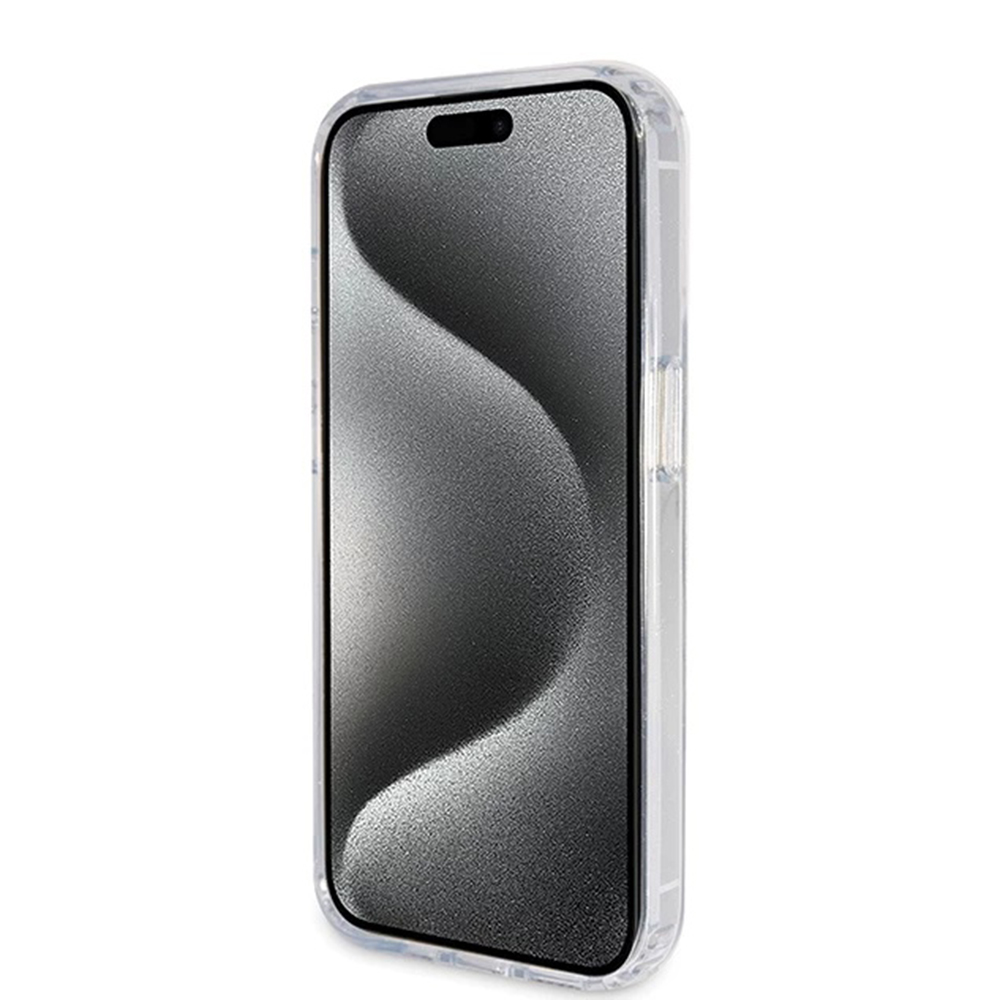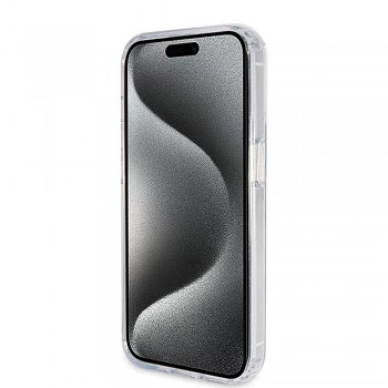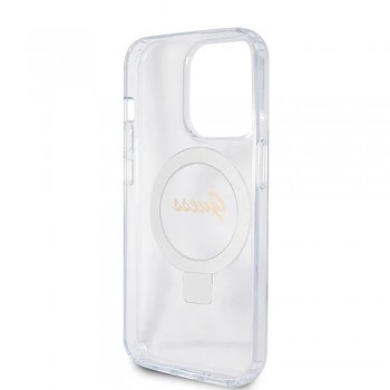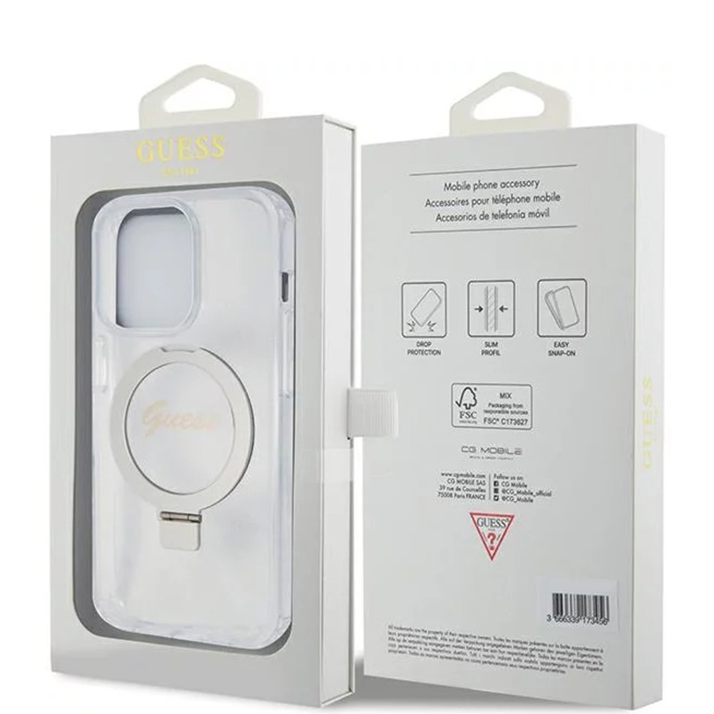 Kryt se pyšní průhledným provedením, které nechá vyniknout krásu vašeho iPhonu. Jeho nejvýraznějším prvkem je integrovaný stříbrný kroužek na zadní straně, který slouží nejen jako praktický stojánek pro pohodlné sledování obsahu, ale i jako bezpečný držák pro pevnější úchop telefonu. Uvnitř kroužku je elegantně umístěno logo Guess ve zlatavém scriptovém písmu, které je obohaceno o jemné třpytky, dodávající krytu sofistikovaný lesk a nádech glamouru. Díky podpoře technologie MagSafe je zajištěna bezproblémová kompatibilita s MagSafe příslušenstvím a rychlé bezdrátové nabíjení.
