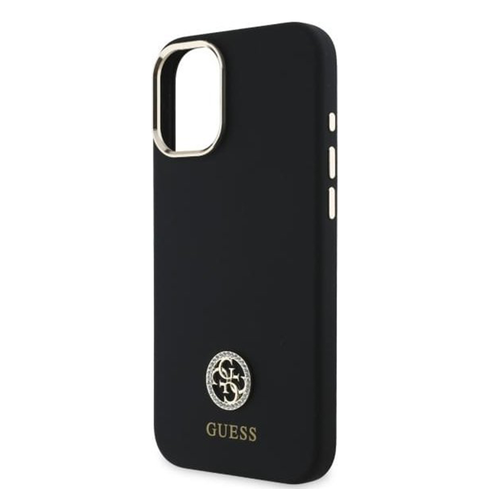 Pouzdro se pyšní minimalistickým, avšak luxusním designem. Jeho povrch je vyroben z hladkého, matného silikonu v sytě černé barvě, který je příjemný na dotek a zajišťuje pevný úchop. Dominantním prvkem je ikonické logo Guess, umístěné ve spodní části zadní strany, které je zasazeno do kruhového rámečku osázeného třpytivými kamínky (strass). Pod logem je pak elegantním zlatým písmem vyveden nápis GUESS. Výřez pro fotoaparát je precizně zpracován a lemován lesklým zlatým rámečkem, který dodává pouzdru punc exkluzivity a dokonale ladí s detaily loga. Vnitřní strana pouzdra je opatřena decentním 4G monogramem, který je typický pro značku Guess a zajišťuje, že váš telefon bude chráněn s elegancí i zevnitř.