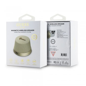 Reproduktor Guess se pyšní kompaktním a sofistikovaným designem ve tvaru elegantního kloboučku či náprstku. Jeho povrch je tvořen kombinací jemné síťoviny v horní části a hladkého kovového podstavce, vše v oslnivém zlatém odstínu. Dominantou je zlaté skriptové logo Guess, které je vkusně umístěno na vrchní straně a dodává produktu nezaměnitelný punc luxusu. Díky magnetickému uchycení se reproduktor snadno a pevně přichytí k zařízením kompatibilním s technologií MagSafe, což z něj činí nejen reproduktor, ale i praktický stojánek.