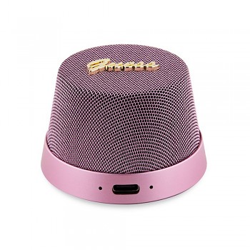 Reproduktor Guess GUWSC3ALSMP se pyšní sofistikovaným růžovým odstínem, který okamžitě upoutá pozornost. Jeho kompaktní, válcovitý tvar s jemnou kovovou mřížkou na horní části a hladkou základnou působí luxusním dojmem. Dominantním prvkem je zlaté logo Guess, které je elegantně umístěno na vrchní straně reproduktoru a dodává mu punc exkluzivity. Díky magnetickému uchycení se reproduktor snadno připevní k zadní straně kompatibilního telefonu, čímž se stane nejen zdrojem hudby, ale i praktickým stojánkem.