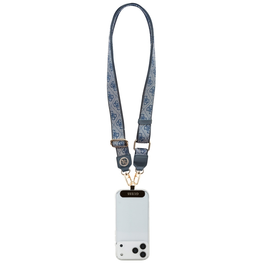 Popruh je vyroben z kvalitní polyuretanové kůže v elegantní modré barvě. Jeho design zdobí ikonický 4G vzor loga Guess, který dodává produktu punc luxusu a originality. Kovové komponenty v zlatavém odstínu, včetně nastavitelné spony a karabin, perfektně doplňují celkový vzhled a zajišťují dlouhou životnost. Dominantním prvkem je kulaté kovové logo Guess, které je navíc osázeno jemnými kamínky (strass), dodávajícími popruhu oslnivý lesk a sofistikovanost. Součástí balení je i praktický tether patch, který se jednoduše vloží mezi telefon a kryt, a umožňuje tak bezpečné uchycení popruhu.