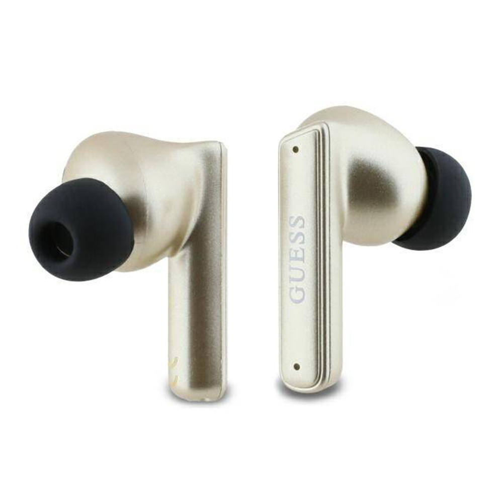 Sluchátka Guess GUTWST88MCTGD se pyšní elegantním zlatým provedením, které okamžitě upoutá pozornost. Nabíjecí pouzdro má hladký, zaoblený tvar kapsle, který perfektně padne do ruky i do kapsy. Na jeho vrchní straně je decentně umístěno logo Guess s rokem založení "EST. 1981", což dodává produktu punc exkluzivity. Samotná sluchátka jsou navržena jako in-ear špunty s ergonomickým tvarem pro maximální pohodlí a stabilitu v uchu. Také na nich najdete jemné logo Guess, které podtrhuje jejich značkovou identitu. Černé silikonové nástavce zajišťují optimální izolaci okolního hluku a komfort při nošení.