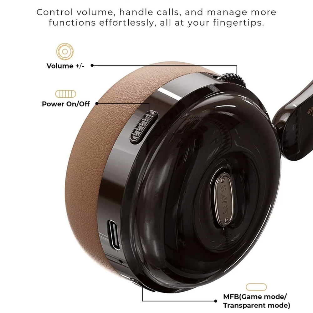 Sluchátka Havit H616BT se pyšní promyšleným a ergonomickým designem. Náušníky a polstrování hlavového mostu jsou potaženy příjemnou hnědou koženkou, která zajišťuje maximální komfort i při dlouhodobém nošení. Robustní, avšak lehká konstrukce v kombinaci s nastavitelným hlavovým mostem, doplněným o elegantní stříbrné detaily, zaručuje perfektní přizpůsobení každé hlavě. Tmavě hnědé lesklé prvky na vnější straně náušníků a decentní perforace na jednom z nich podtrhují moderní a minimalistický vzhled. Na vnitřní straně ramene hlavového mostu je navíc decentně vyveden nápis "Focus on Audio", který zdůrazňuje zaměření značky na zvukovou kvalitu. Ovládací prvky a nabíjecí port USB-C jsou diskrétně umístěny na spodní straně náušníku pro snadný přístup.