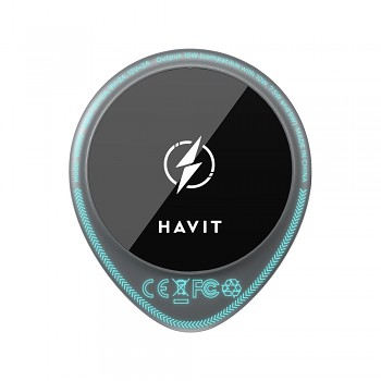 Držák Havit W3036 se pyšní elegantním kruhovým designem v matně černé barvě, který se dokonale hodí do interiéru každého moderního vozu. Na přední straně dominuje logo HAVIT a symbol blesku, signalizující funkci nabíjení. Okraje držáku jsou decentně podsvíceny modrým indikátorem nabíjení, který dodává produktu futuristický vzhled a informuje o stavu nabíjení.